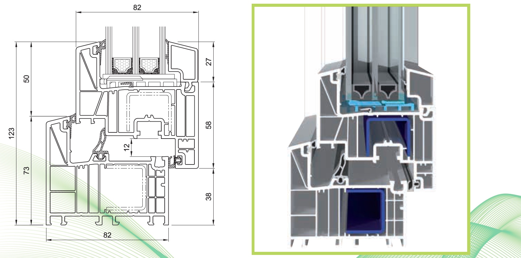 Si tratta della serie di profili Brügmann con una profondità in opera di 82 mm, la quale combina eccellenti caratteristiche di risparmio energetico con innovativa tecnologia di tenuta al massimo livello ed è ottimamente idonea come componente per edifici passivi.